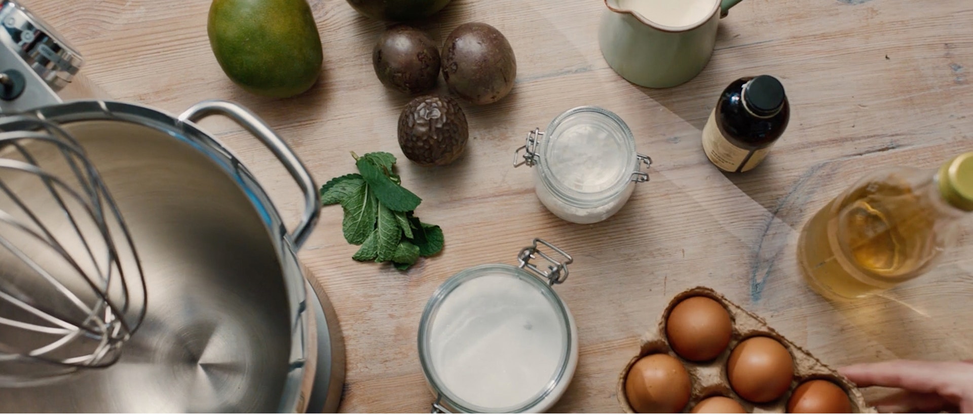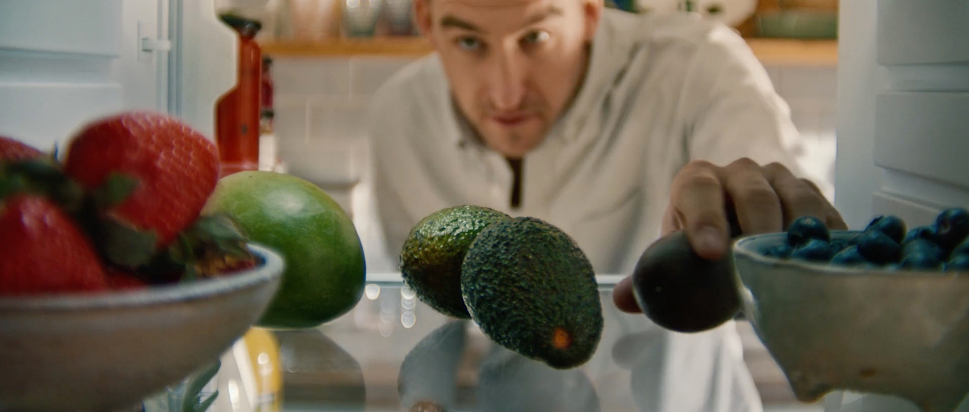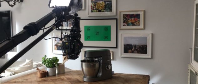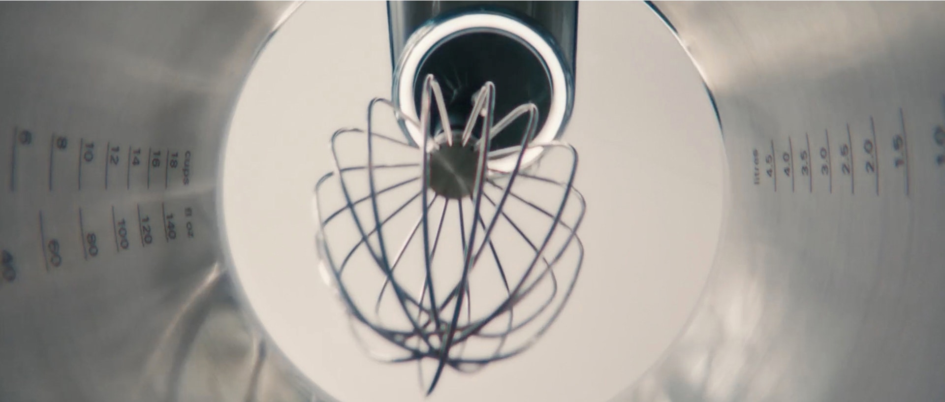 In this film, I wanted to place the camera in some unusual and technical positions that were unexpected. To achieve the shot from the bottom of the whisk bowl, we cut a hole inn the bottom of the mixer so that our periscope lens and camera could look through the bottom of the machine. Similarly, we had a fridge with the back wall removed so that we could shoot through the ingredients contained inside.